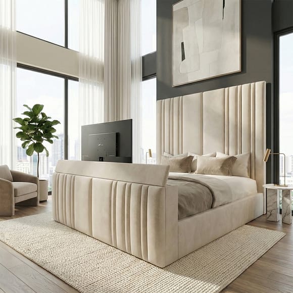 Bring hotel-style luxury and everyday convenience into your bedroom with the Bedflix® Davinci TV Bed Frame. Designed for modern living, this premium TV bed frame combines a sleek, upholstered look with a smart integrated TV solution, so you can enjoy your favourite films, box sets, and live sport from the comfort of your own bed. Whether you are upgrading your master bedroom or creating a standout guest room, the Davinci is built to make relaxing feel effortless, while keeping your space tidy, stylish, and beautifully organised.